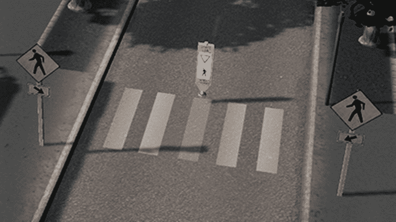 Post with sign indicating that vehicles should yield to pedestrians in the crosswalk