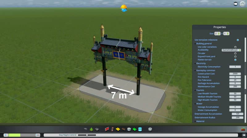 The building is placeable anywhere. Please use any mod with Road Anarchy (NoPillars / Sharp Junction Angles) to place the gate on top of the street. The distance of the pillars is 7m.