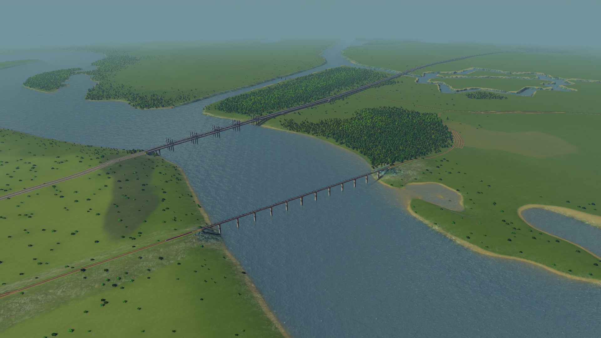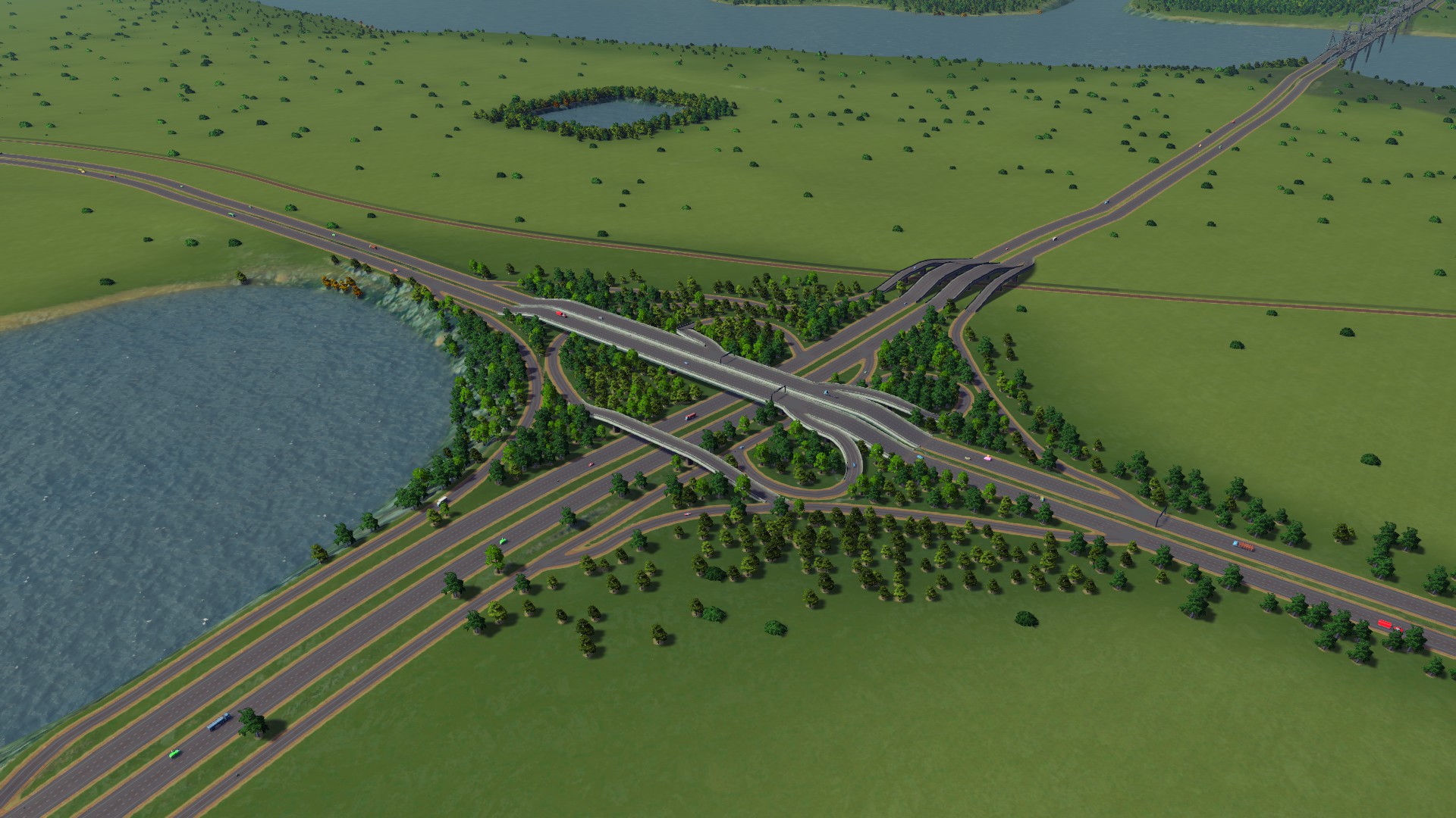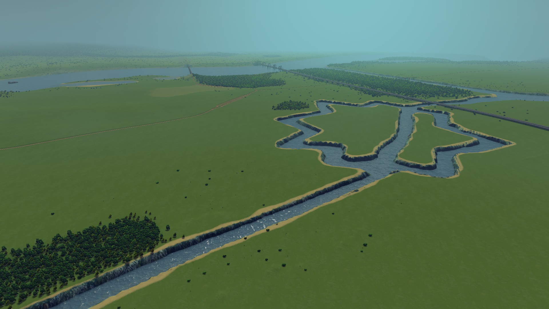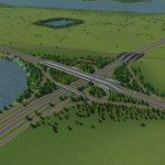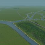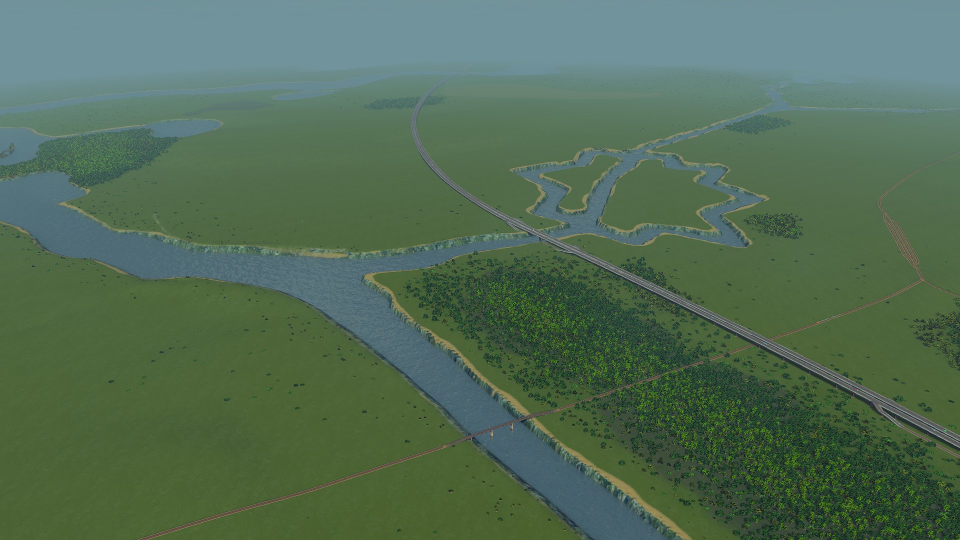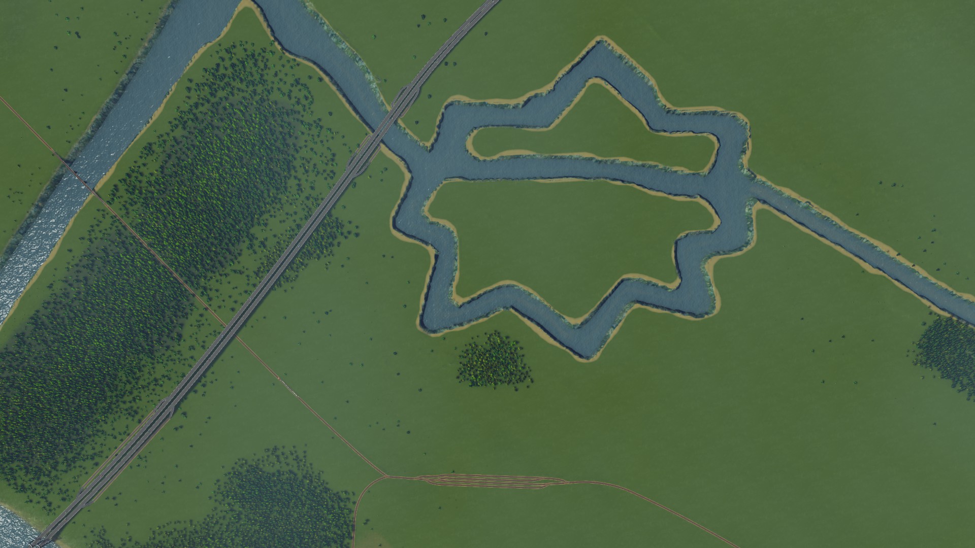 The map itself isn’t based on a heightmap, I couldn’t get that to work. I created it with data from the AHN. Therefore the scale is a bit off, water masses are slightly oversized. Which is also good, because otherwise the city moat wouldn’t have a current. I’ve recreated the Knooppunt Hattemerbroek, which has highway connections in the A50 toward the west and south, and the A28 to the south and east. Rail is limited to four directions: Kampen, Amersfoort, Deventer, and Groningen. This is because of the limit on 4 outside connections.